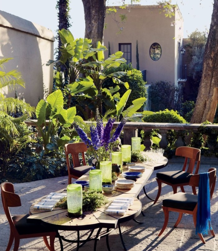 Em San Miguel de Allende, México, as mesas no terraço de jantar têm design de Fisher Weisman. Note que nas laterais elas cabem mais utensílios e possuem as bordas circulares, para acomodar, também, mais pessoas. Foto, Simon Watson.
