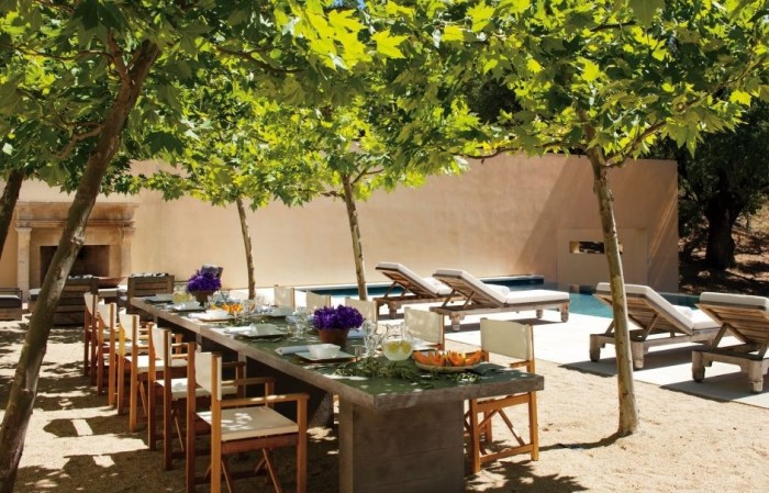 Em Woodside, Califórnia, uma área externa descontraída, à sombra de árvores frondosas e ao lado da piscina, tem mesa de concreto – perfeitas para resistir às intempéries – e as famosas cadeiras do Diretor, de Janus et Cie. O paisagismo é de Arquitectura Paisagista Andrea Cochran. Arquiteto, Backen, Gillam & Kroeger Architects. Designer, Abril Powers. Foto, Roger Davies.