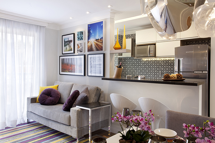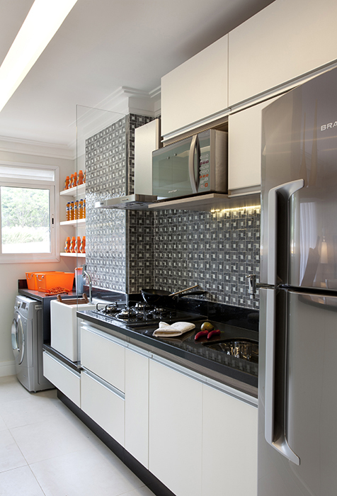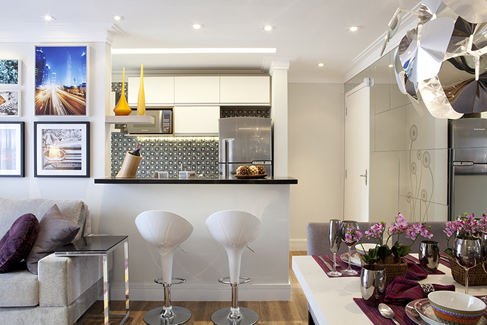 Com apenas 57 m² na planta original, a arquiteta Adriana Fontana criou um projeto com o melhor aproveitamento dos ambientes, usando recursos como a integração entre eles, com destaque para o living agregado à cozinha. A decoração do apartamento pequeno, com a aplicação de uma bancada de mármore sobre a meia parede existente, possibilitou a sensação de amplitude e uma maior área de circulação. A sala de estar começou sendo elaborada levando em conta o pouco espaço. O resultado é a mesa de MDF com acabamento laqueado branco, presa a parede, oferecendo maior conforto.