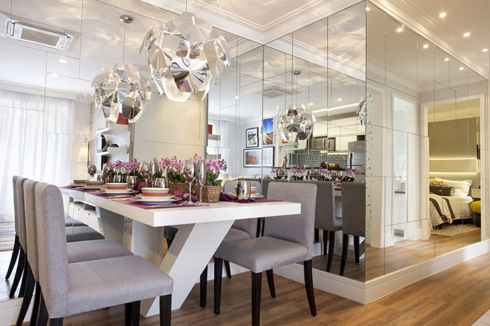 O espelho reveste a parede próxima à mesa de jantar e segue em direção aos quartos. Com desenho de mosaico, no estilo Mondrian, ele foi criado com uma composição de quadros de espelhos em tamanhos retangulares, colados na horizontal e vertical. “Estes espelhos foram utilizados como artifício para ampliar o ambiente e gerar mais profundidade na mesa de jantar”, explica a arquiteta.