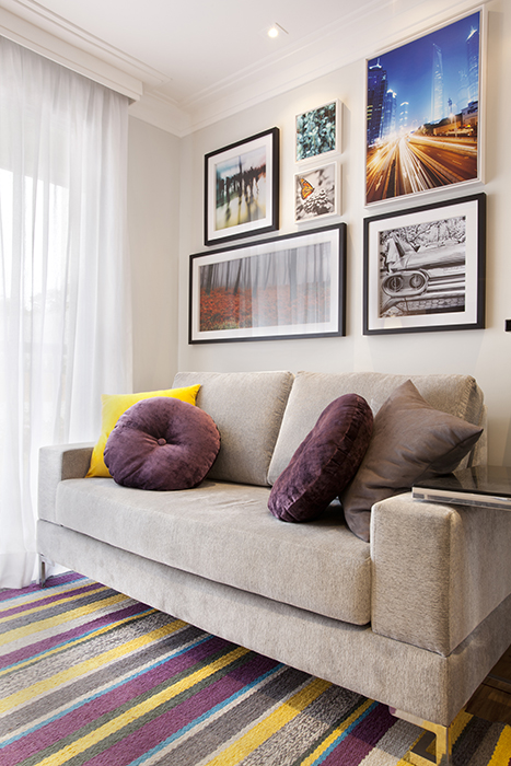 A paleta de cores contrasta tons neutros nos móveis grandes e tonalidades fortes nos detalhes, favorecendo o jogo de texturas, como as almofadas de tecido veludo na cor roxa e algodão amarelo, e o tapete de chenille. Esses pequenos toques tornaram o apartamento pequeno moderno e descontraído, agradando ao jovem casal. As paredes receberam quadros de tamanhos diversos e paisagens de metrópoles e florestas.