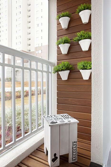 A lâmpada contínua segue da cozinha à área de serviço e ilumina os dois ambientes, destacando a sensação de amplitude do espaço. O piso retificado usado na cozinha é o mesmo para a lavanderia, separada por um vidro incolor apenas na bancada. A varanda, revestida do chão ao teto com madeira de demolição, dá o toque de sustentabilidade e agrega delicados vasos de plantas.