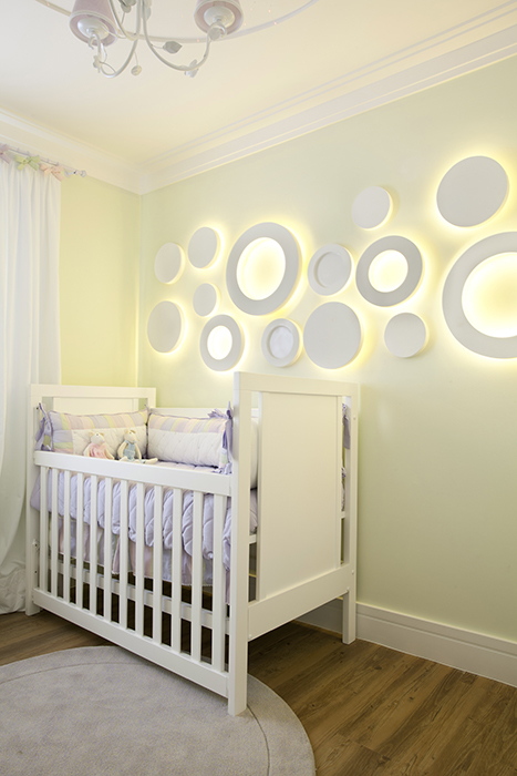 Com a espera do primeiro filho do casal, o segundo quarto do apartamento já foi projetado para receber a criança. O destaque fica por conta da iluminação que recebeu um centro levemente rebaixado, imitando um céu com estrelas produzido em fibra óptica com tecnologia que modifica gradativamente as cores. Para dar um toque divertido ao ambiente, os fios da fibra se mantêm aparentes. A parede oposta tem revestimento de papel de bolinhas coloridas, cujo formato oval privilegia os nichos repletos de bichinhos de pelúcia.