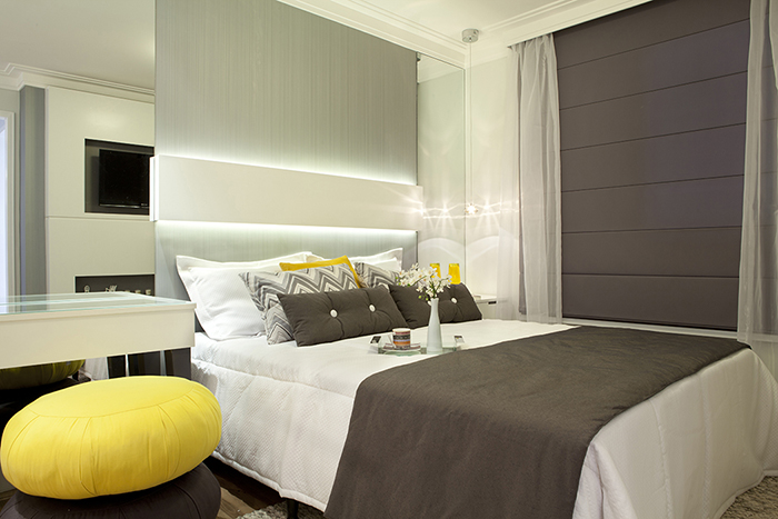 Inspirado em Mondrian, a sofisticação do jogo de espelhos combina com a delicada escolha de móveis e acessórios. Foto: Divulgação