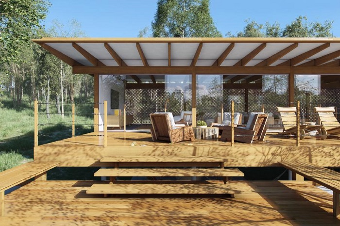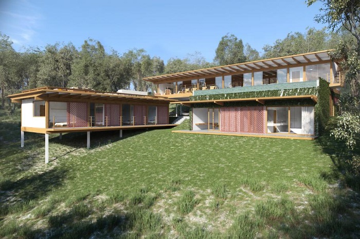 A implantação da residência no terreno de 1.600 m² respeitou a topografia natural e toda a vegetação do espaço. Dividida em dois pavilhões, o primeiro bloco, o social, pode ser acessado pelos visitantes por uma ponte feita de madeira com beirais trabalhados, com a função de proteger a casa de praia sustentável da chuva e do sol.