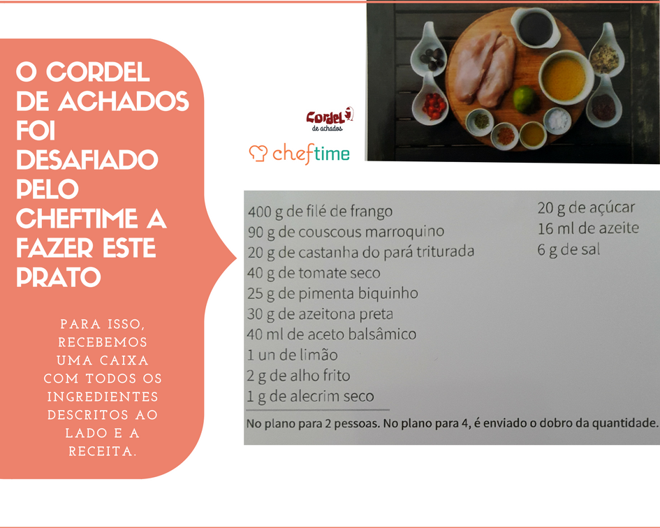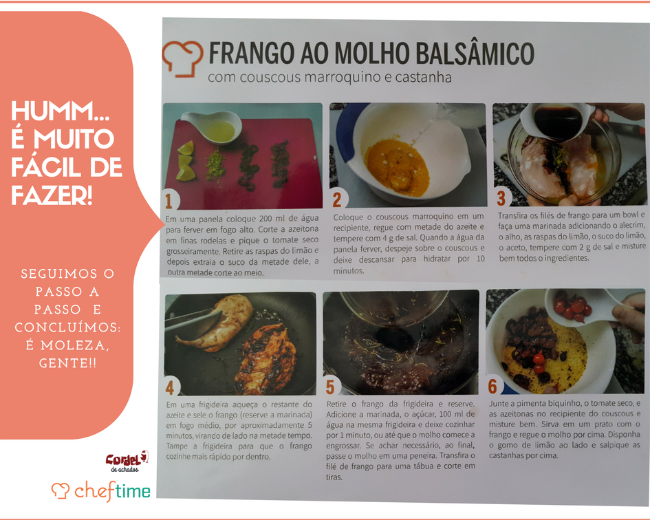 Bancamos o chef de cozinha, e deu certo! Recebemos do Cheftime um kit com ingredientes e a receita do prato “Frango ao Molho Balsâmico com Couscous Marroquino e Castanha”. Para quem não conhece, o Cheftime é um clube no qual associados recebem um ou mais kits de refeições assinadas por chefs renomados para fazer em casa. Os ingredientes vêm na medida certa, para não haver erros ou desperdício.