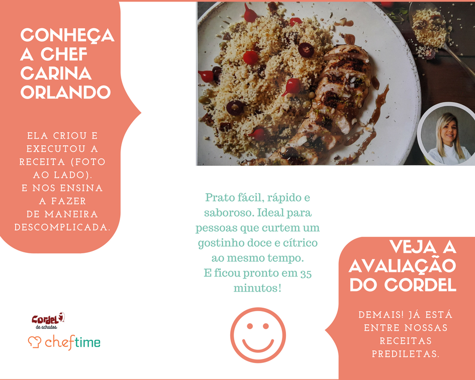 Preparamos “Frango ao Molho Balsâmico com Couscous Marroquino e Castanha” – receita da chef Carina Orlando – e ficou uma delícia. Para ter sucesso “de primeira”, contamos com a ajuda do Cheftime.