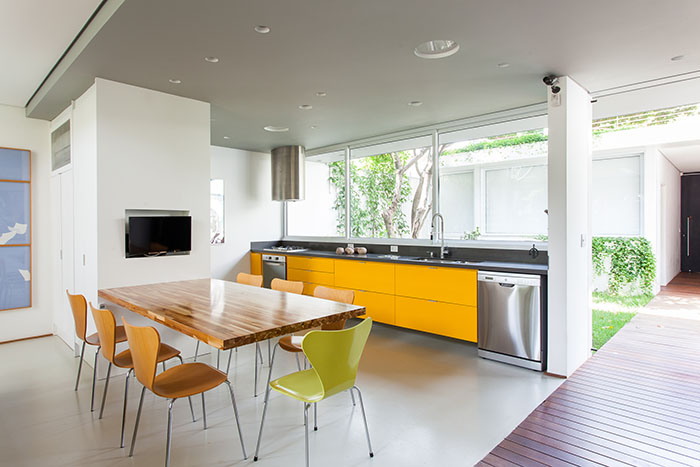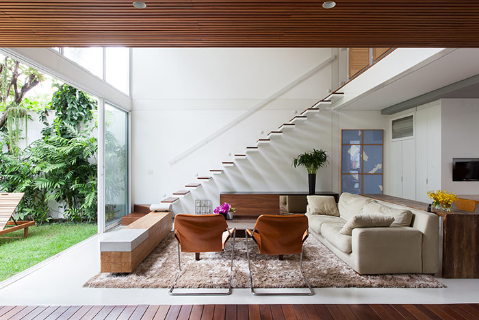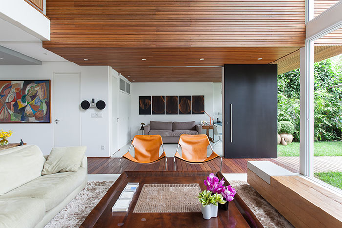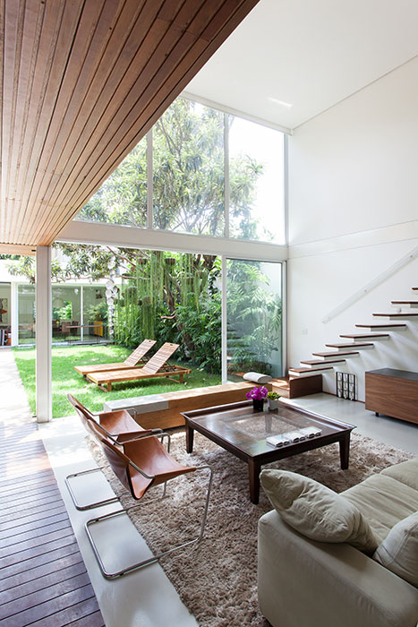 Além disso, alguns pontos-chave eram fundamentais à família: intimidade e tranquilidade. “Era imprescindível ter privacidade, pois ali também funcionaria um ambiente de trabalho; e, por fim, a residência deveria estar apta a receber convidados”, conta Clara. As arquitetas, então, propuseram uma casa construída do zero, privilegiando a interligação entre ambientes.
