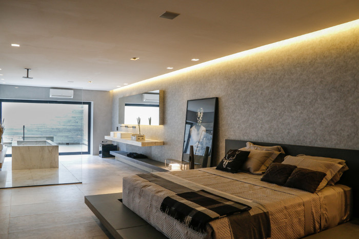 Um dos principais destaques é o uso dos cobogós, com grandes nichos vazados. Eles integram os elementos e preenche a área. A adaptação entre área externa e interna é feita com três grandes portas projetadas em aço e vidro, requintadas e modernas. O estilo minimalista e a beleza ganham o toque final com a decoração, feita com peças de cerâmica brasileira, além de persianas e tapetes de diferentes texturas.