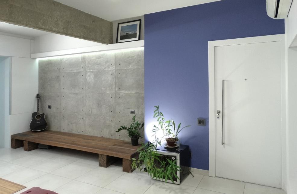O painel de cimento queimado foi feito de forma artesanal, utilizando apenas cimento, bianco e água. A modulação inspira-se na obra do arquiteto Tadao Ando. É feito com placa de MDF, espátula para marcar as arestas e broca para os furos sobre o emboço fresco.