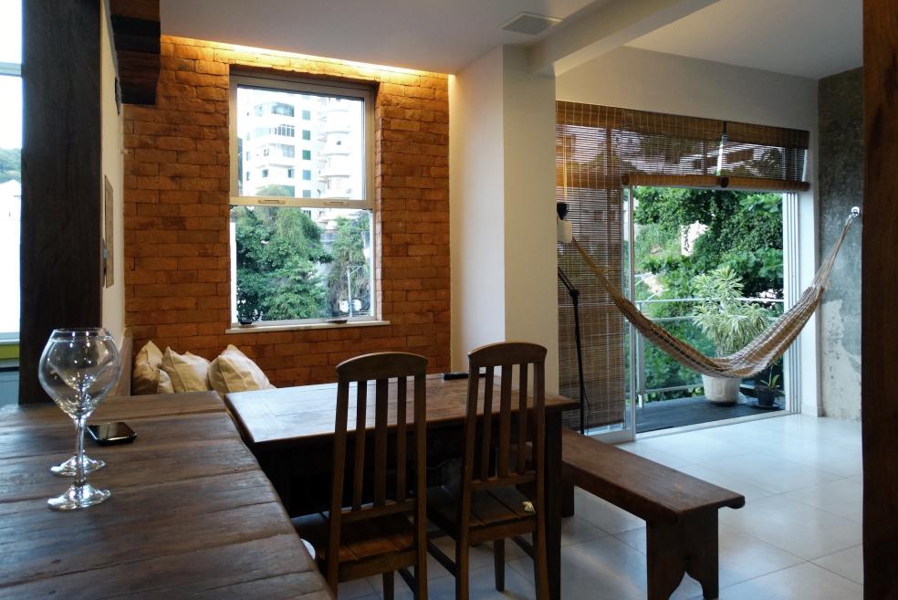 Antes, o apê localizado no pitoresco bairro de Santa Teresa, zona central carioca, era de dois quartos. Agora ele ostenta um charmoso vão integrado, com pilares e vigas estruturais expostos e máxima entrada de luz natural. Com 80% das divisórias internas demolidas, o apartamento de 78 m² virou loft em uma reforma que durou cinco meses e poupou apenas as paredes do banheiro e entre a sala, cozinha e área de serviço.