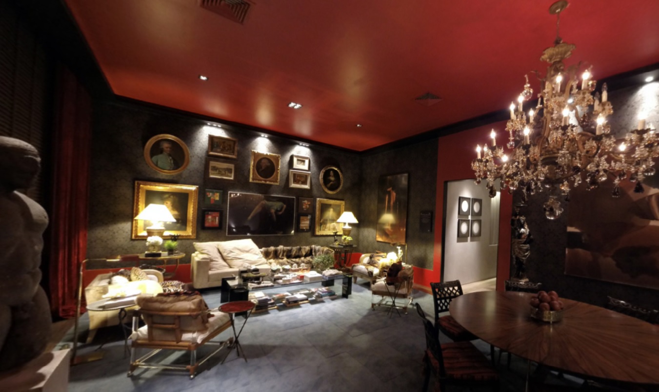 O living, com ar refinado e elegância impecáveis, traz glamour e brilho em uma miscelânea de diversos estilos – chinoiserie, neoclássico, art déco e moderno – , sem representar uma mistura. Ele exala sofisticação e confiança, com um tom de bravata. O espaço evoca a sensação de escapismo através de quadros exuberantes, esculturas, lustre de cristal voluptuoso do século 18, da Baccarat, peles de animais, art déco e motivos neoclássicos, incluindo toques de exotismo e avant-garde.