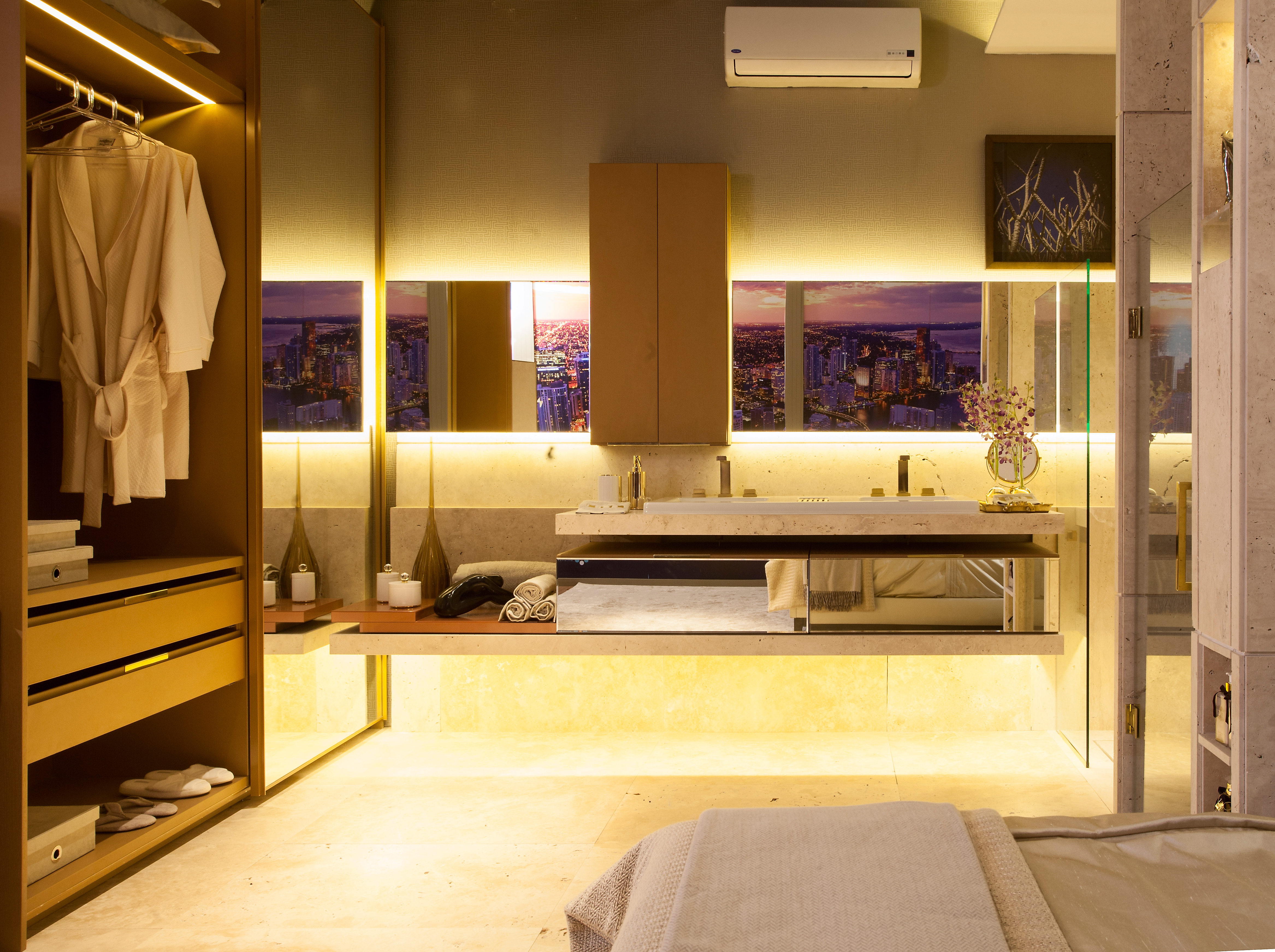 Imagem da suíte, com integração entre quarto, closet e banho. Foto: Levi Mendes Jr.