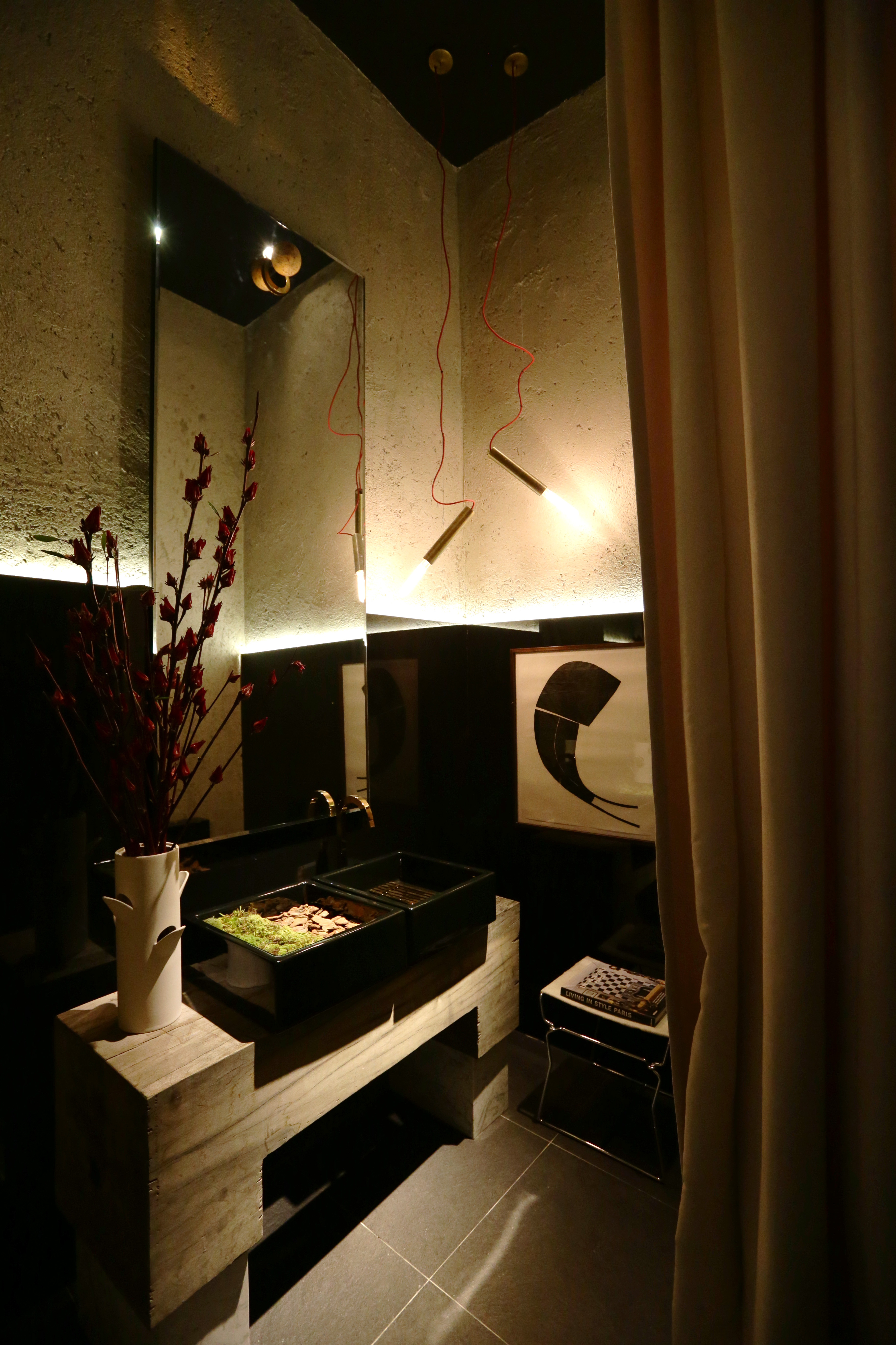 O ambiente apresenta uma mescla de referências desde os materiais até o mobiliário. Os dormentes, usados na arquitetura de interiores por meio de caixas, aparecem no hall de entrada e na adega. O mobiliário italiano integra-se a peças genuinamente brasileiras do século 20, cuja assinatura reúne ‘feras” como Zanine Caldas, Oscar Niemeyer e Sergio Rodrigues. As tramas vão do luxo à rusticidade, com tecidos de veludo mesclados a cortinas feitas de sacos de café. As paredes seguem o mesmo caminho: a laca gloss contrasta com superfícies sem pintura, enquanto couros rústicos compartilham a cena com linhos e veludos.