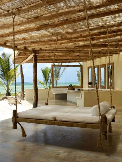 6. Estilo Contemporâneo. Nesta variação europeia, a tradicional rede é transformada em cama, com estrado rústico e suspensa por cordas.