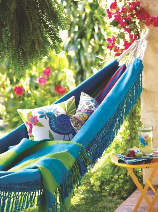 5. Estilo Moderno. Cores vivas e a nova forma de usar – como cadeira – cativam os apaixonados por redes. Feita com o tecido da própria peça, mas com acréscimo de almofadas na estrutura.
