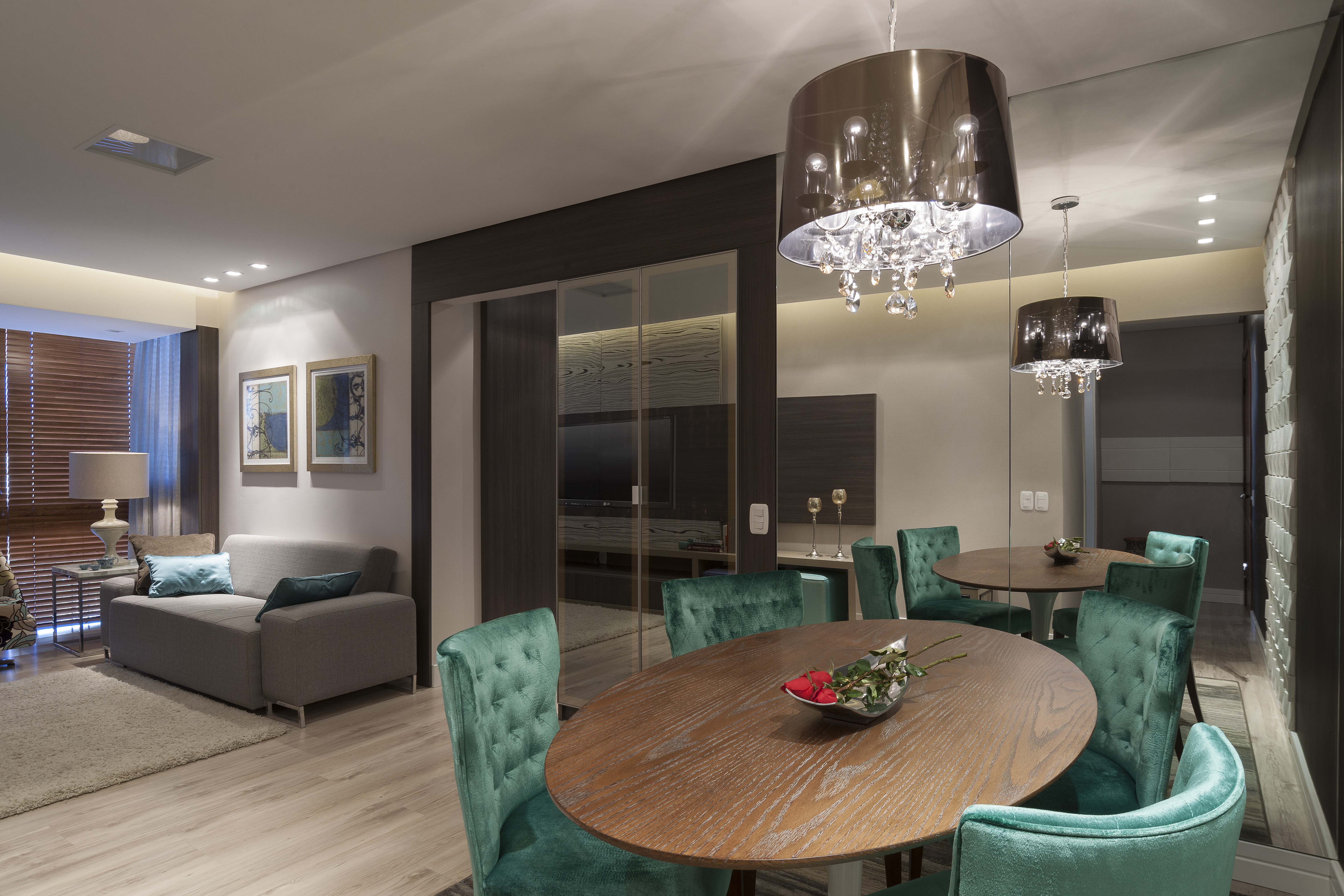 Na sala de jantar, o pendente de cristal acima da mesa de jantar se impõe. Refletido pela grande parede espelhada, ele ajuda a ampliar o ambiente, ao deixar a impressão de que tudo no espaço é maior do que parece. As cadeiras revestidas de veludo capitonê verde-petróleo, posicionadas próxima a uma parede espelhada, que ajuda a ampliar o lugar. Do outro lado, o pequeno painel amadeirado e a parede revestida de pedra cimentícia com relevo criam um ar retrô na sala de jantar integrada.