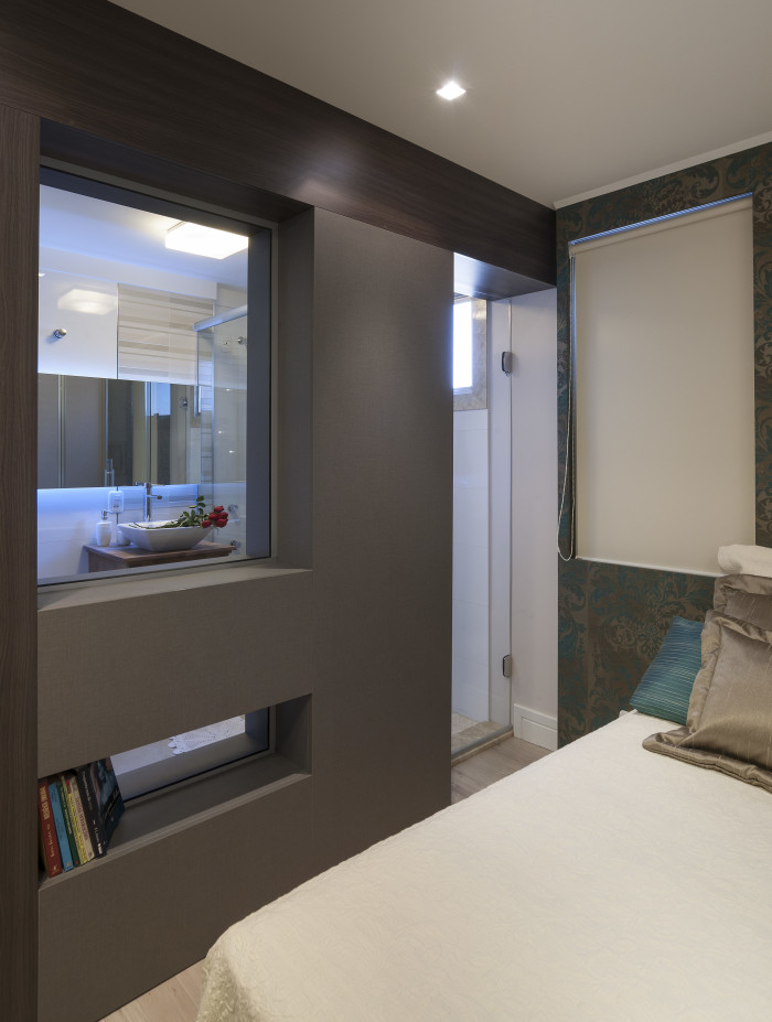 A planta do pequeno apartamento ganhou respiro com a retirada de algumas paredes de alvenaria para a criação da suíte-máster. No lugar foram projetados armários que assumem a função de dividir o ambiente, organizando a área do banho, home office e closet. As paredes divisórias têm portas de correr de vidro refletivo bronze para acessar o banho e o dormitório.