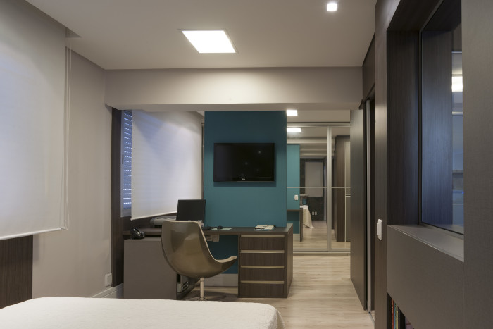 A bancada de estudos divide o quarto e o closet. O painel turquesa organiza o espaço e ainda embute a televisão.