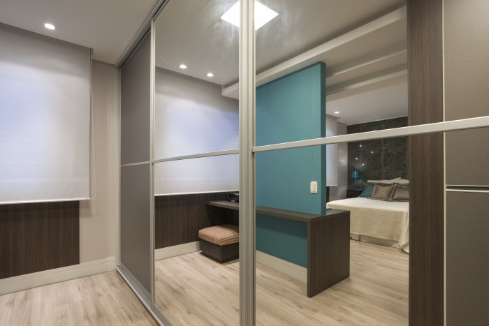 Com as paredes de alvenaria removidas, a arquiteta criou armários-divisórias compostos por portas de correr de vidro refletivo bronze para acessar o banho e o dormitório. “A solução deu uma multifunção para o closet, que agora desempenha também o papel de área de circulação. Ele nada mais é do que um longo corredor que acessa o quarto a partir do living”, explica Cristiane.