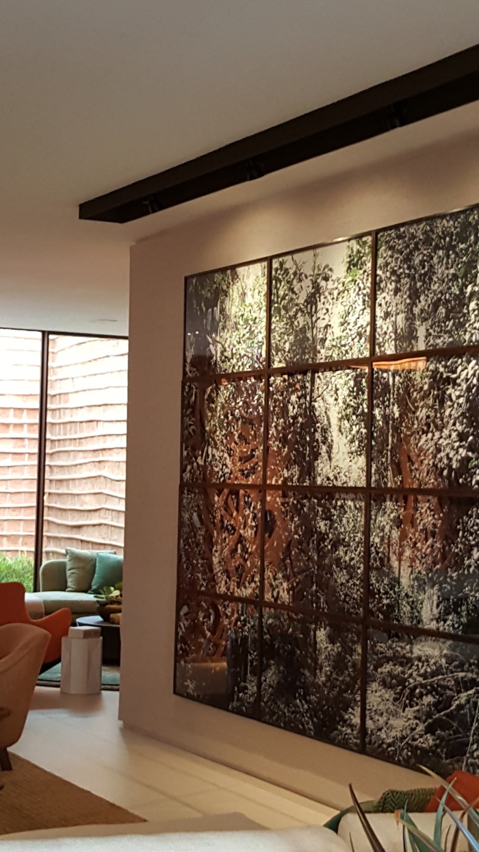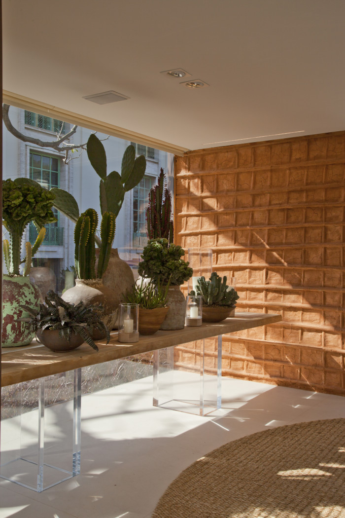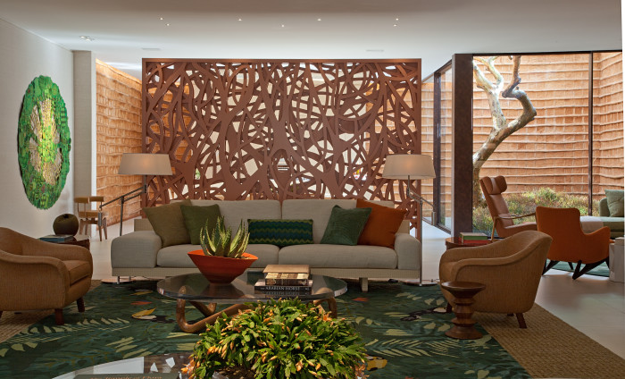 Na decoração idealizada para a Casa Cor São Paulo 2015, há paredes feitas com a técnica de pau a pique, revestimentos de aço cortén, frutas tropicais como o cacau empregados em itens decorativos e um grande tapete com oito metros de extensão, com estampa da fauna e flora do Brasil confeccionado por artesãos do Nepal.
