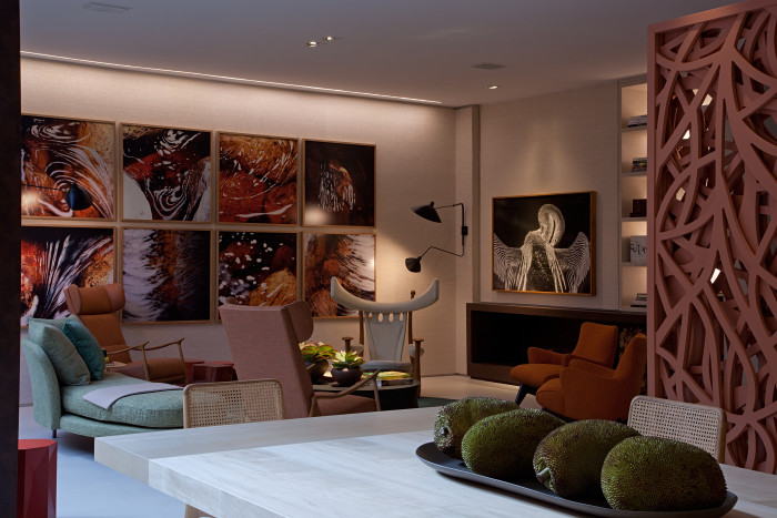 Móveis em tons claros, como os da cozinha, e paredes de pau a pique em tons terrosos vindos do barro formam a base do espaço. As tonalidades fortes são encontradas nas obras de arte de Vik Muniz e de Rodrigo Petrella. Outros grandes nomes do design nacional, a exemplo de Sérgio Matos, Joaquim Tenreiro e Sérgio Rodrigues estão presentes por meios de suas obras conceituadas.
