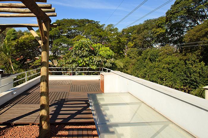 Ao acessar a escada marinheiro e atravessar um alçapão deslizante, é possível chegar ao solário, um terraço dotado de uma bela vista do bairro. Ele também serve como uma área de lazer da casa, tornando-a mais espaçosa. O solário, dividido entre área de deck, com piso revestido em madeira, e área de pergolado, recebeu caibros de madeira rústica durante a reforma, para abrigar um telhado verde no futuro. O conforto térmico é assegurado por pequenas pedras de argila arredondadas e leves.