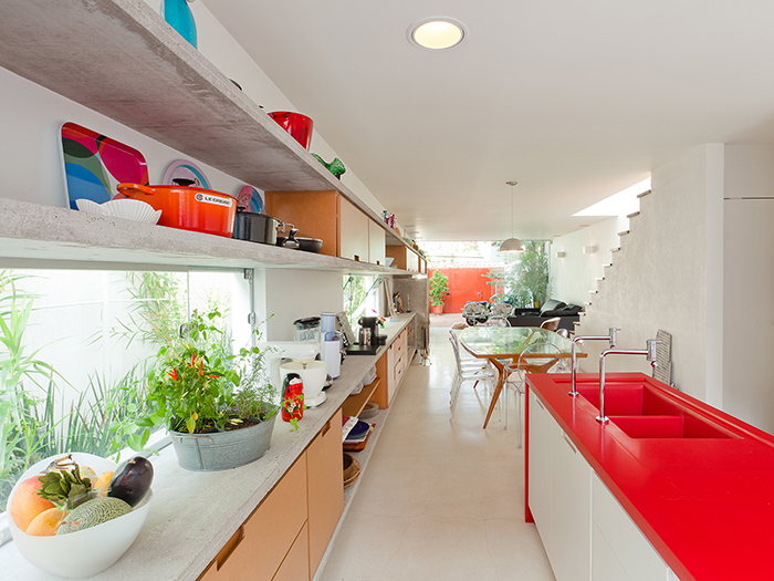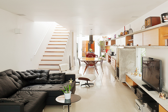 A solução deu tão certo que os 166 m² de área construída somam quase o total do terreno. Living e cozinha tornaram-se um só, organizados em pavimentos por uma estante de concreto de 13 metros – de ponta a ponta, ela serve às salas de estar e jantar e à cozinha. O móvel, construído com módulos de MDF cru, agrega armários, bancadas e apoios, garantindo uma solução econômica, pois pode ser feita durante a parte civil da obra.