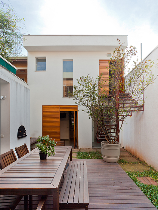 “Conservamos a edícula, com lavanderia no térreo e acréscimo de suíte no andar superior. Praticamente mantivemos o projeto da reforma original, com exceção da ampliação no nível da casa, do aumento no pé-direito e de uma abertura zenital na escada, responsável por trazer mais iluminação para o interior”, explica a arquiteta.
