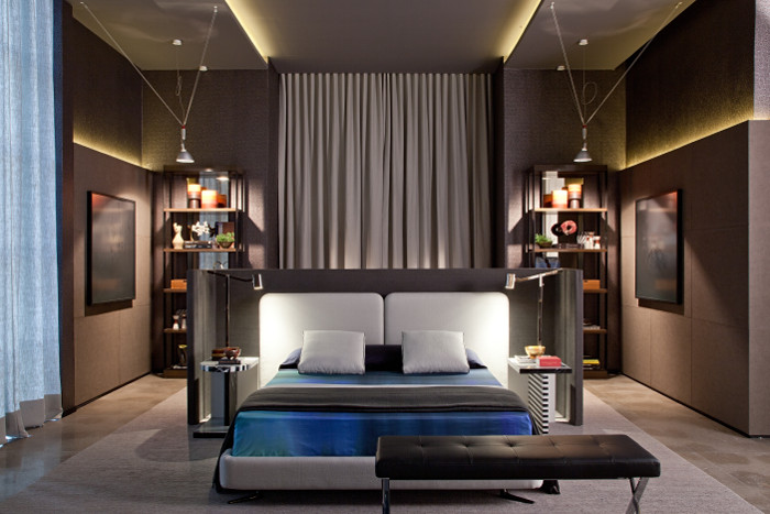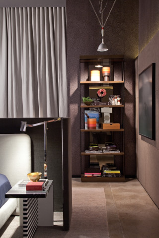Sem divisórias óbvias e aproveitando as possibilidades de integração entre os ambientes, os layouts dos móveis servem para distribuir as áreas, ampliar a sensação de conforto e oferecer praticidade. O home office também indica o perfil do admirador da Suíte Máster: alguém que não abre mão da versatilidade e da elegância para se aconchegar em casa.