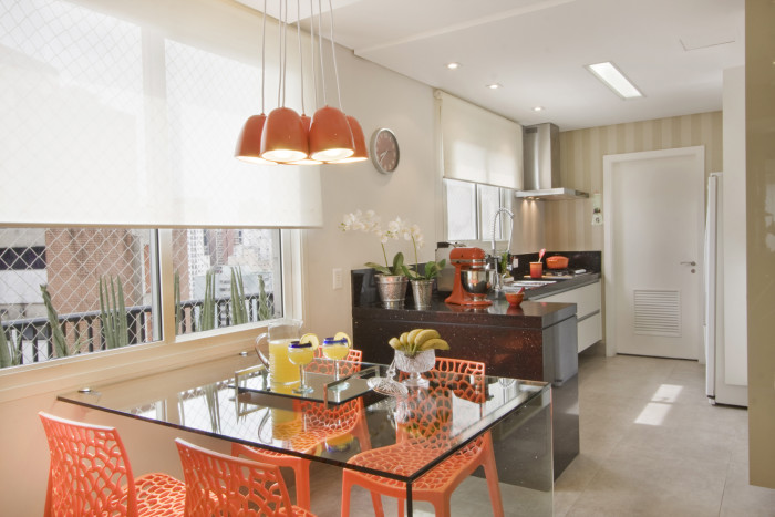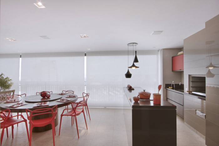 Cozinha gourmet, espaço de jantar e sala fazem dessa varanda gourmet o espaço perfeito para receber os amigos e a família. Nela é possível desdobrar todas as etapas que um bom anfitrião exercita ao receber em casa. Dá para bater um bom papo na sala enquanto se degusta aperitivos e petiscos; organizar e preparar os comes e bebes na prática cozinha de apoio; e provar de um bom churrasco na grande mesa circular, com centro móvel, próxima à bancada e churrasqueira