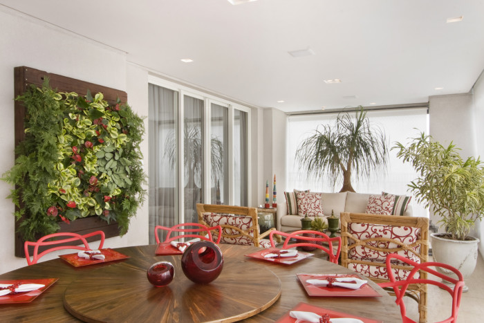 No apartamento de 320 m², a ampla varanda reúne todo o conforto para confraternizar com família e amigos. Nela é possível ter cozinha gourmet, jantar e living e ainda apreciar o jardim vertical.