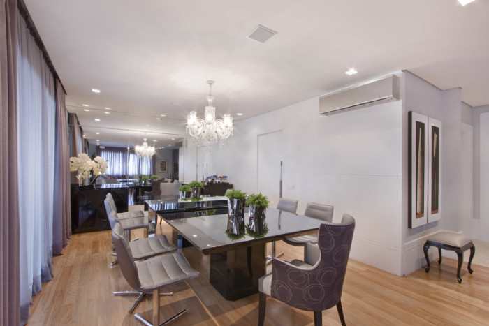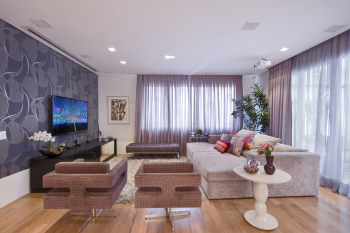 No apartamento de 320 m² o desafio da designer de interiores Rose Diani foi tornar o amplo espaço aconchegante. Para isso ela direcionou todo o projeto à integração de ambientes. Assim, living e home theater em um só espaço são integrados à sala de jantar. Ao unir os espaços de maneira funcional e confortável, a profissional criou o ambiente ideal para receber amigos e familiares.