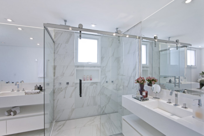 O uso de formas geométricas é um dos principais realces do banheiro do casal, com revestimento em porcelanato.